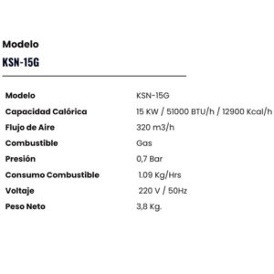 El Turbocalefactor a Gas Kosner KSN-15G ofrece una capacidad calórica de 15 kW (51,000 BTU/h o 12,900 KCAL/h), siendo una opción eficiente para la calefacción en una variedad de entornos. Con un caudal de 320 m³/h y funcionando con gas, este equipo proporciona un calor rápido y efectivo. Con una presión de 0.7 Bar y un peso de 3.8 kg, es ligero y fácil de transportar. Su consumo de combustible es de 1.09 kg/h, lo que lo hace económico de operar. Funciona con un voltaje de 220V y 50 Hz, con dimensiones compactas de 380 x 190 x 305 mm. Este turbocalefactor a gas Kosner está diseñado con protección contra sobrecalentamiento y «cut-off» para evitar fugas de gases, lo que lo hace seguro de usar en una variedad de aplicaciones, incluyendo obras de construcción, edificios, bodegas, eventos deportivos, graneros y fábricas.